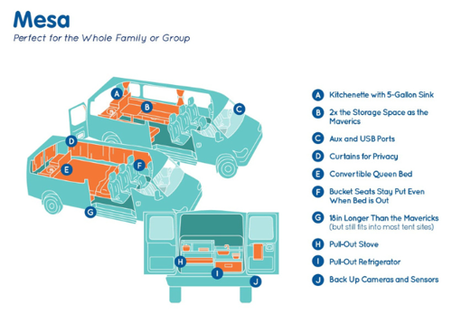 This fuel - and space - efficient model is perfect for solo road trippers or couples who don't need the extra space that the Mesa or Mavericks offer.