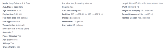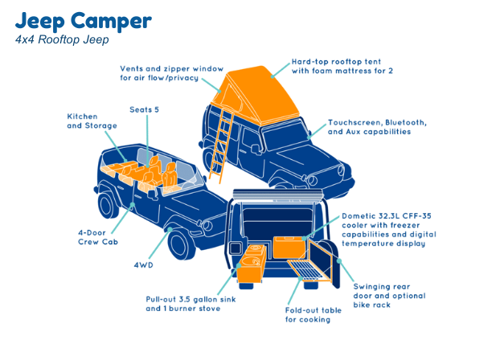 This 4x4 rooftop Jeep Camper comes with an easy-to-use pop-up hard shell rooftop sleeper tent and a custom-built kitchenette for extended trips or weekend getaways. It's fully equipped with automatic transmission, cruise control, heating and AC, 4-wheel drive, an 8.4 inch Uconnect touchscreen with Apple CarPlay and Android Auto support.