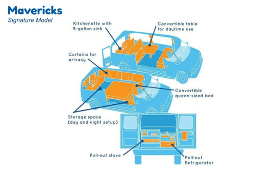 The Mavericks is a popular choice for its big comfy bed, functional kitchen, and all-around great design. Optional rooftop sleeper for a second couple or the kids.