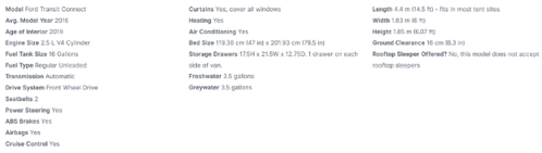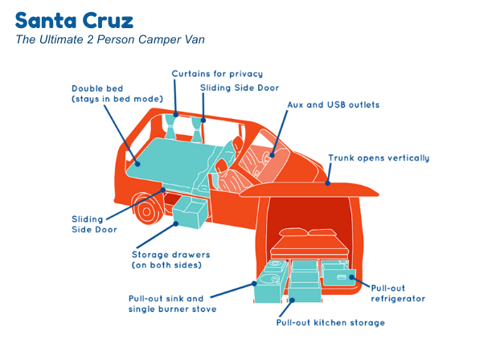 This 2-person van provides a full-time bed set up in the back and a space-saving kitchen with a 1-burner pullout stove, 3.5-gallon sink & water tank, and dual-powered refrigerator. Store your clothes in the drawers, grab your groceries & hit the road!