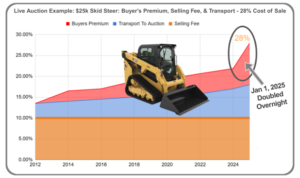 So what does this mean for the buyer and the seller? At the largest online auction company the buyer is now paying 10% on a regular basis for any item up to $25,000. For example, in 2024 the buyer's premium of a $25,000 skid steer was $1,213. This year, that has more than doubled to $2,500! This is a huge new tax on buyers. When buyers bid they are acutely aware of all these fees, they budget for them, and it detracts from the purchase price due to bidding suppression. Who is impacted the most? The seller - in the form of reduced proceeds or net returns. In practical terms, at some companies $0.28 of every $1 spent on a skid steer never reaches the seller — it’s lost to fees: selling, buying, and logistics.